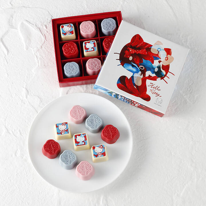 ハローキティを転写したボンボンショコラは、リンゴガナシュをホワイトチョコレートでコーティング。資生堂のシンボルマーク“花椿”をかたどったチョコレートは、ほんのりシナモンが香るリンゴチョコレート、やさしい甘さのストロベリーチョコレート、フランボワーズガナシュをホワイトチョコレートでコーティングした3種類のフレーバーが味わえる。