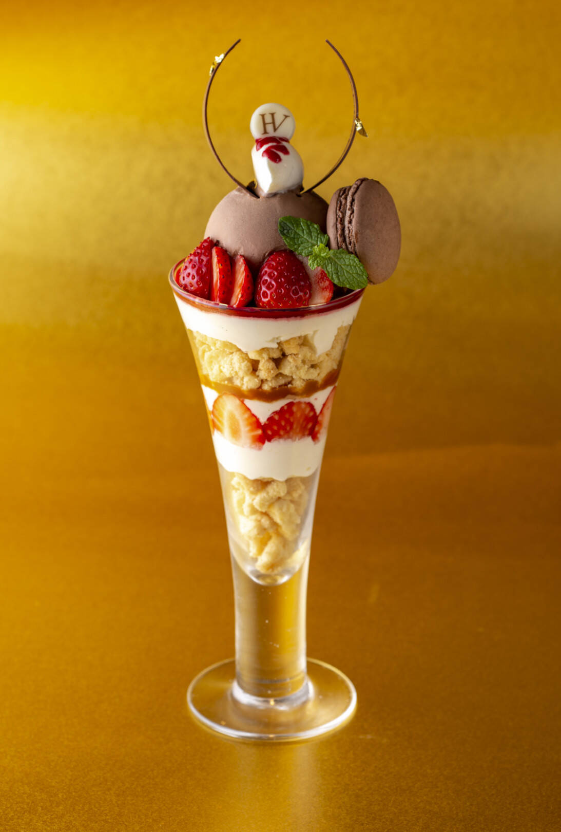 本館1階のユーゴ アンド ヴィクトールの「パフェ ド ノエル」(税込1,870円)は、フレッシュストロベリーを贅沢にあしらったクリスマスらしいパフェ。ほんのりビターなショコラアイスやショコラ味のマカロンを添えて、大人も楽しめる仕上がりに。スパイスの利いたサクサクのクランブルやキャラメルソース、まろやかなシャンティクリームがスプーンを進める度に味の変化をもたらす。