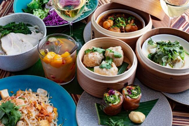 タイのリゾートホテルを彷彿とさせる、クラシックサイアムがテーマの店内。アジア独特の色使いや竹細工、木の木目を組み合わせたテーブルなど、素材感を感じられるマテリアルで大人なリゾートを演出。横浜の海が見える店内は、ビッグテーブルが印象的なメインダイニング、ゆったりとくつろげるソファ席、個室としても使えるリビングスペースで構成され、バーエリアにはアジア各国の麺を楽しめるヌードルバーを併設。シーンごとに様々な楽しみ方が生まれます。