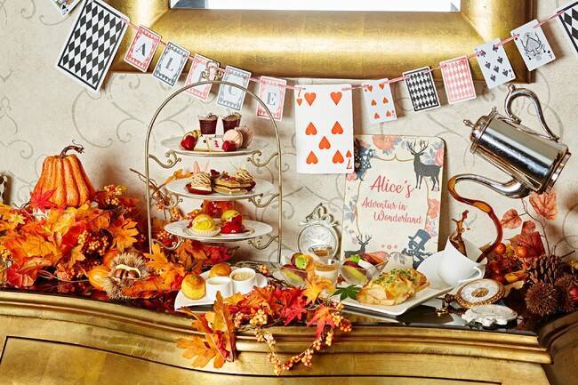 2か月間限定の秋のアフタヌーンティーは、チェシャネコの小瓶マカロンや3月ウサギのモンブラン、トランプ兵のオペラ、ハートの女王のムース、イモムシのかくれんぼシュークリームなど、「不思議の国のアリス」をイメージした大人かわいい秋のスイーツが登場。軽食やスコーン、紅茶とともにご堪能ください。