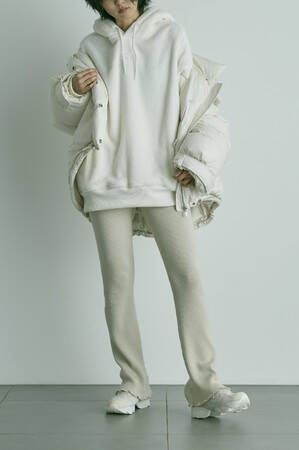 SNIDELとグローバルフィットネスライフスタイルブランドReebokとの別注コレクションが実現。真冬を彩り、女性をよりフレッシュに際立たせるチョークホワイトに、トレンド感のあるオリジナルのスカイブルーがポイントに。