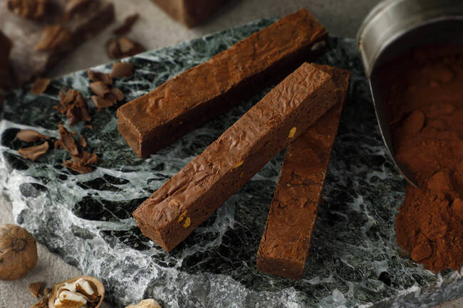 厳選したクーベルチュール、チョコレートをブレンドした生地にラム酒の香りをきかせました。しっとり、もっちりした食感が愉しめる生チョコレートのようなブラウニーです。