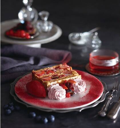 苺、フランボワーズ、ブラックベリーなどの数種のベリーとフランボワーズ色のホイップクリームを、サクサクに焼き上げたパイ生地でサンドしています。一皿一皿、赤いエッセンスを加えたシェフ自慢の料理を楽しんだ後は、「真っ赤なエリザベスパイ」と赤いハイビスカスティーで締めくくります。