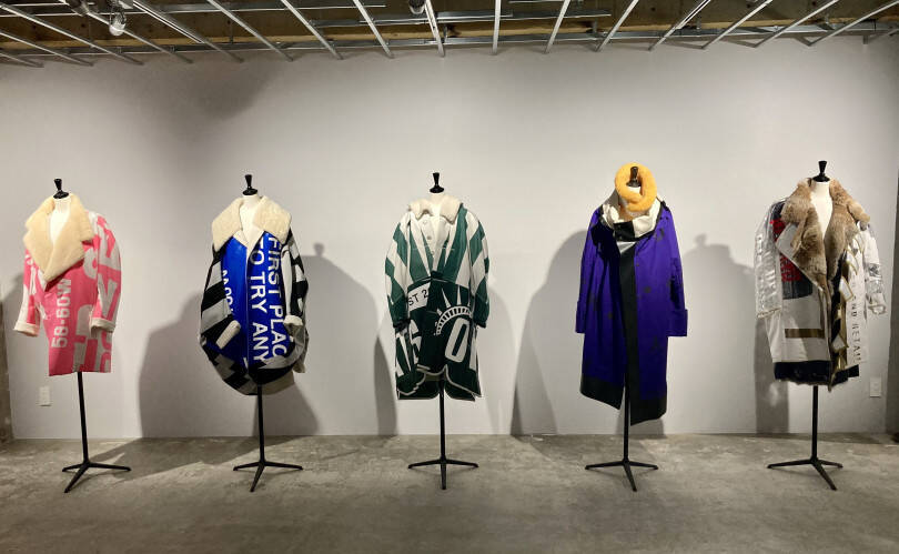 オーニングという日本では馴染みの無いNYの街を象徴する店舗用素材をパタンナーならではの視点によって、プロダクトを”展開”したまさに“オーバーコート”。「オートクチュールと違い、僕たちの仕事であるプレタポルテは型紙さえあれば何千枚でもまったく同じモノが作れることが重要。16歳でこの仕事に就いて以来、立体物は頭で展開図にして考える癖がついてしまっている」と大丸氏が言うように会場には、パターンで製作された女神像のアートピースなど、職人ブランドとしてのもの作りのバックグラウンドを提示する展示も行われている。