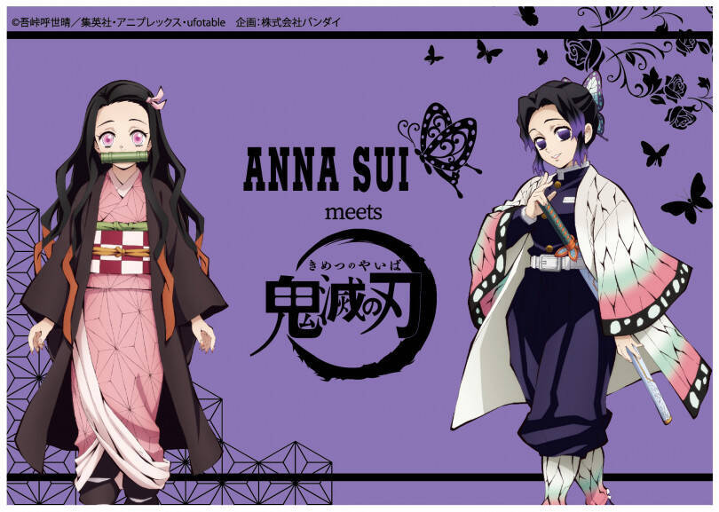 「ANNA SUI meets 鬼滅の刃」と題された本コレクションでは、メインヒロインである竈門禰豆子と胡蝶しのぶ・胡蝶カナエ・栗花落カナヲの胡蝶姉妹にフィーチャーし、アナ スイのブランドモチーフである蝶や薔薇とコラボレーションしたオリジナルデザインを制作。禰豆子の着物の柄と薔薇を組み合わせたデザインや、胡蝶姉妹の蝶の髪飾りをアナ スイらしい手法で描いたデザインなど、鬼滅の刃の世界観とアナ スイの世界観を融合させた、特別なアイテムがされる。