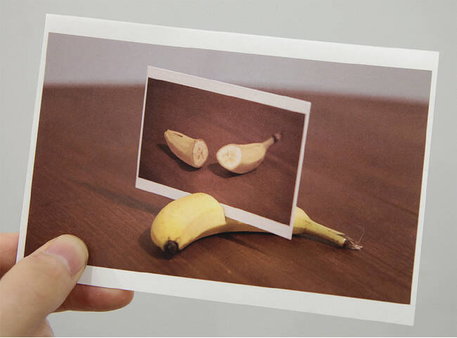 大小2台のポストカードスタンドとポストカードによる作品。ポストカードには、それぞれバナナとアーリーレッド(赤玉ねぎ)が写っているポストカードを用いて、バナナと赤玉ねぎをカットしている様子が写っている。またそれぞれのラックにはバナナの房状、タマネギの球根状にポストカードが配置されている。