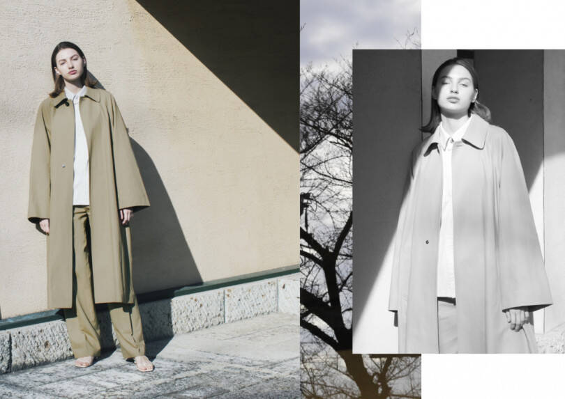 コットンリネンストレッチ素材で清涼感を持たせたブラウンのオーバーサイズのコートやシャツジャケットは、同素材のワイドパンツとのセットアップでブランドの代表的なスタイルを提案。