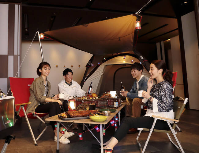 コールマンのテントやチェアなどキャンプグッズで装飾した個室の空間で、キャンプ料理をビュッフェで楽しめます。全天候型、準備不要で気軽にキャンプ気分を味わえます。