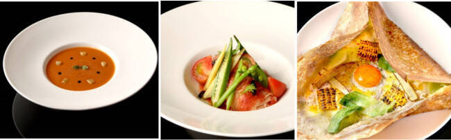 夏にしか味わえないジョエル・ロブションのスペシャリテメニュー「冷たいトマトのガスパチョ 小さなクルトンを浮かべて」は、完熟トマトの程よい酸味を感じる冷たいスープです。バジルの爽やかな香り、クルトンの食感と共にお楽しみください。