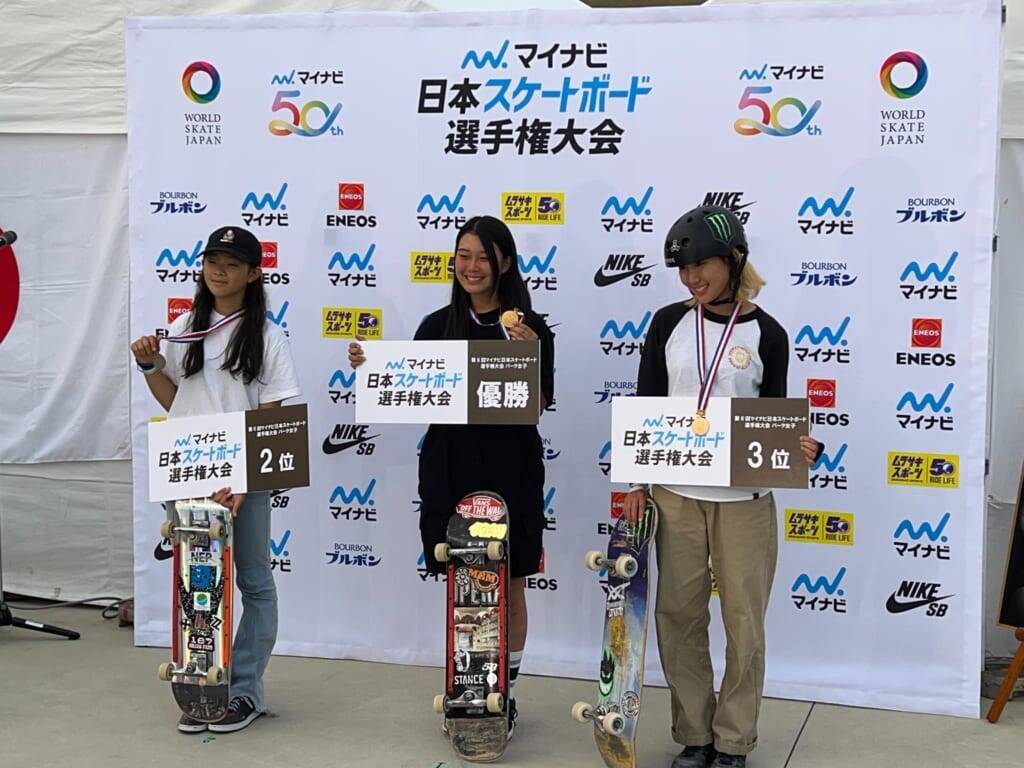 「1位を獲れたことは素直に嬉しいのですが、3本目でキックフリップ・インディーをミスして満足いくランができなかったことも悔しいです。地元茨城の開催だったんですが、みんなが「ひなの頑張れ!」って応援してくれたことが嬉しかったです。来シーズンはまだパリ五輪の予選が続くので良い成績が残せるように頑張ります!」