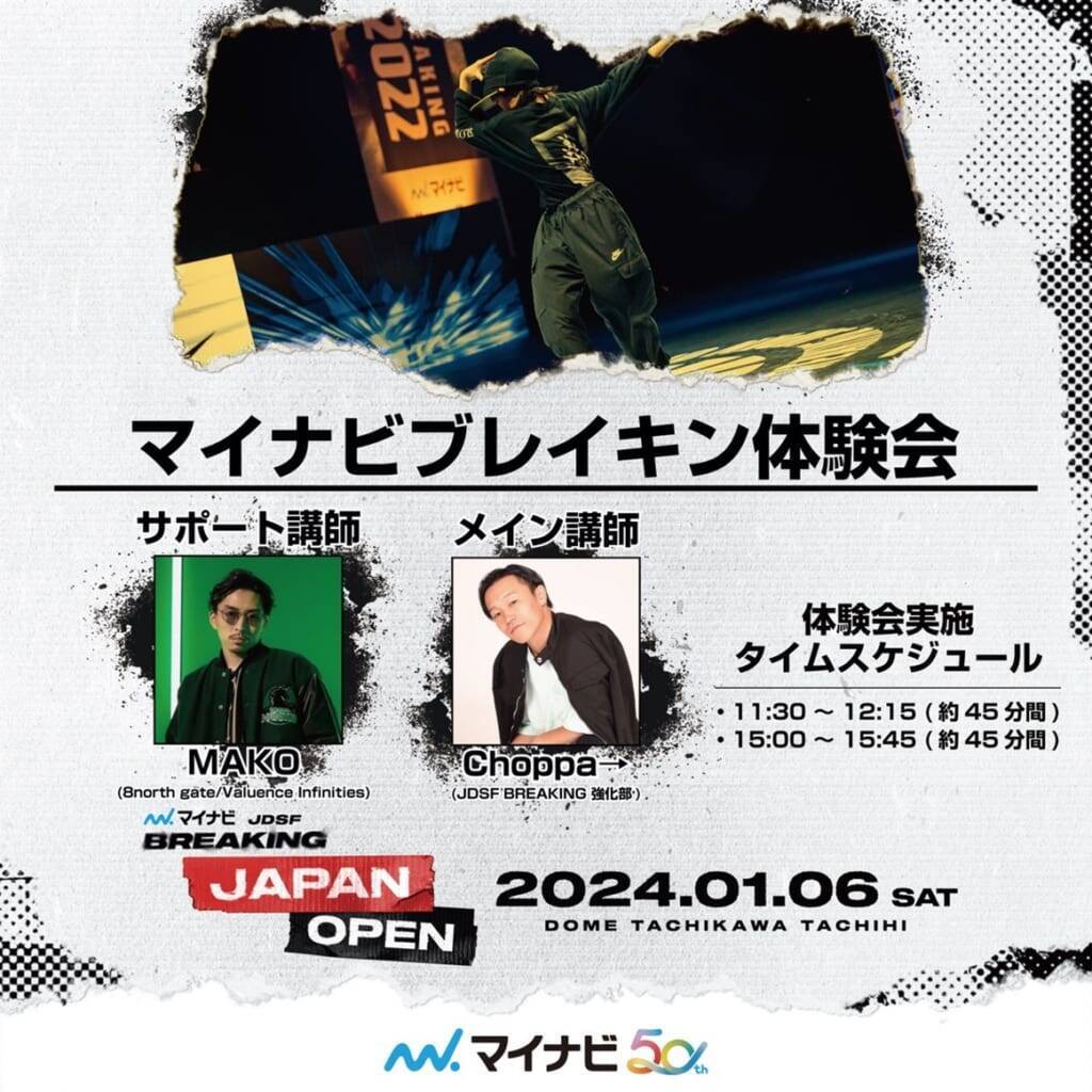 公益社団法人日本ダンススポーツ連盟 ブレイクダンス本部(以下 JDSF)は、来る2024年 1月6日(土) ドーム立川立飛にて、「マイナビJDSF ブレイキン ジャパンオープン2023」を開催する。本大会は2024年2月17日(土)、18日(日)に開催予定の「JDSF 第 5 回 全日本ブレイキン選手権 (以下、全日本) 」への出場権を争うポイント付与が最大の大会であり、所属ブロック(※1)に関係なく参加が可能となっている。