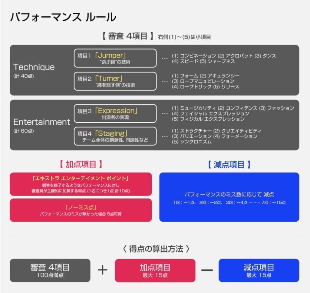 特にミスの多発しやすいダブルダッチにおいて、“ノーミス”が優遇され、逆にミス数によって減点される制度は、パフォーマンスの大会としては唯一無二。