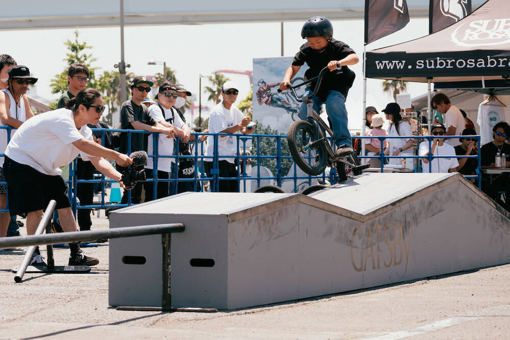 近年注目を集めるBMXの中でも、世界的に最も愛好者の多いジャンルと言われるBMXストリート。今回のステージでは、両端のバンクとクォーターの間に変幻自在の「SUBROSA STREET RAIL」が点在し、中央にはCHIMERAオリジナルセクション「KINKY TAIL」が設置された。