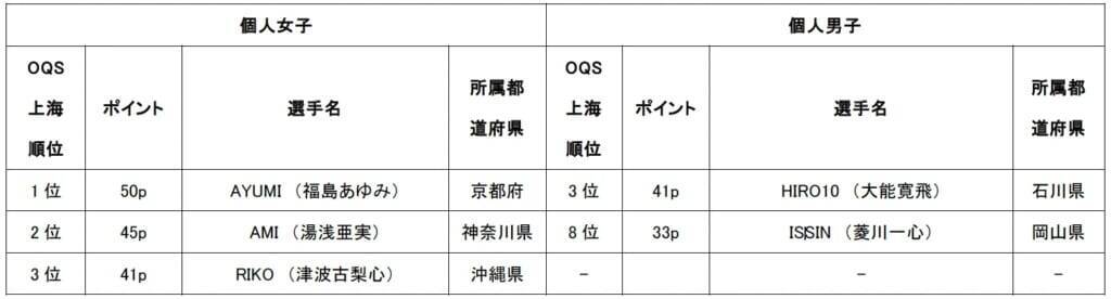 いずれの選手も、2大会の合計ポイントが原則上位7位以上(変更の可能性あり)の出場条件を満たした場合に出場権の獲得となる。