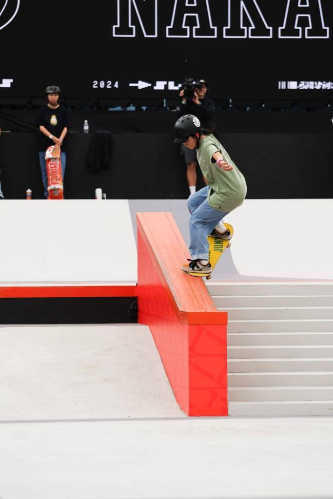 赤間に続いた西矢も「フロントサイドビックスピンボードスライド」や「バックサイドクルックドグラインド」を中心に構成したランでフルメイクすると6.8ptをマークし安定的なスコアを残して次に繋げた。