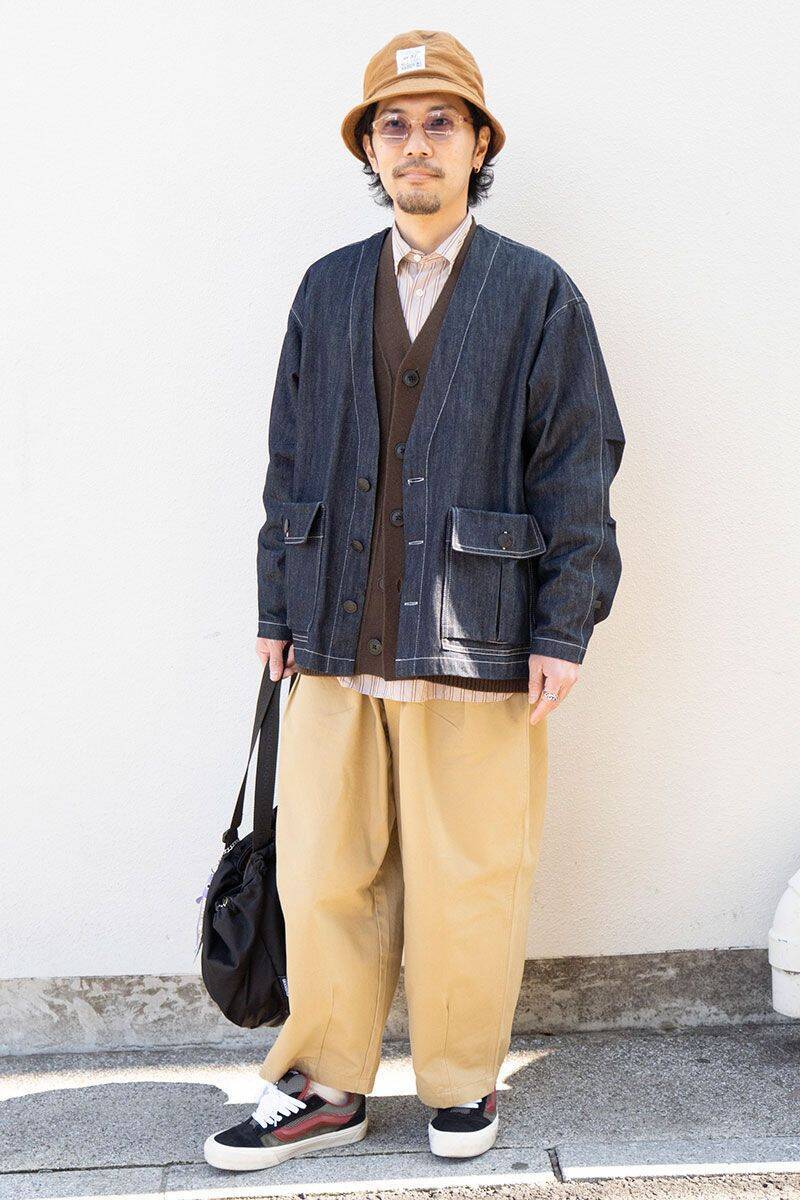 ジャケット、 パンツ=ともに不明 カーディガン=ユニクロ シャツ=マーカウェア シューズ=ヴァンズ 帽子=カシラ 眼鏡=ジュガードフォーティーン バッグ=エヌハリウッド×アウトドアプロダクツ リング=ヴィンテージ池田敬忠さん(39歳)