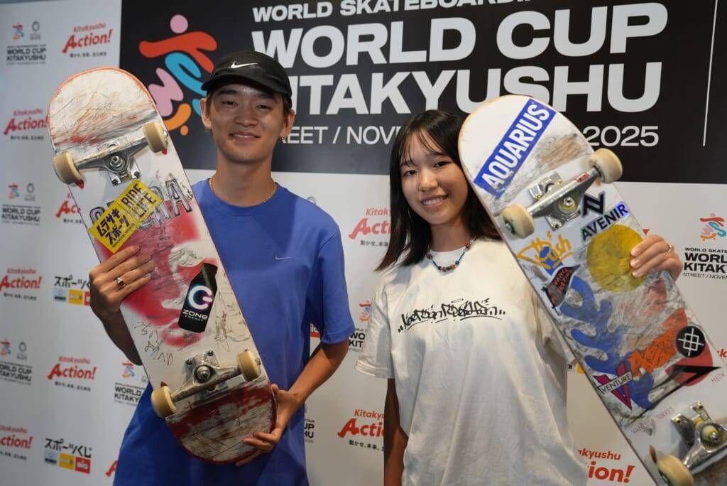 今年、2025年11月23日(日)~11月30日(日)の7日間にわたり、福岡県北九州市にて開催される世界最高峰のスケートボード・ストリート種目の大会「ワールドスケートボードストリート2025 北九州」の開催発表会見が、2025年8月5日(火)に北九州市・小倉で開かれ、北九州市長の武内和久氏、大会事務局長の河野眞二氏、そして今大会出場予定選手である2023年度世界チャンピオンの白井空良選手とパリオリンピック金メダリストの吉沢恋選手の4名が登壇した。