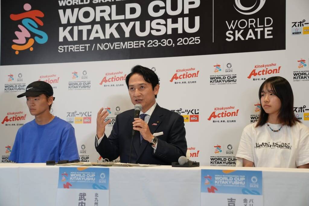 今年、2025年11月23日(日)~11月30日(日)の7日間にわたり、福岡県北九州市にて開催される世界最高峰のスケートボード・ストリート種目の大会「ワールドスケートボードストリート2025 北九州」の開催発表会見が、2025年8月5日(火)に北九州市・小倉で開かれ、北九州市長の武内和久氏、大会事務局長の河野眞二氏、そして今大会出場予定選手である2023年度世界チャンピオンの白井空良選手とパリオリンピック金メダリストの吉沢恋選手の4名が登壇した。