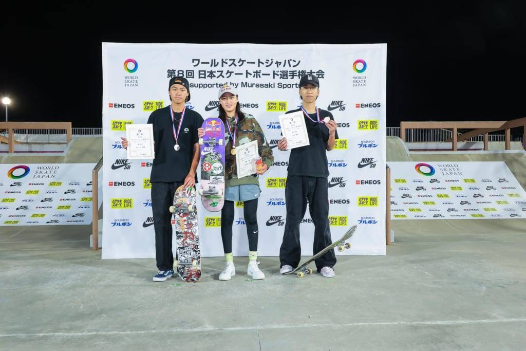 東京・有明の「livedoor URBAN SPORTS PARK」内スケートパークで開催された「ワールドスケートジャパン第8回日本スケートボード選手権大会 supported by Murasaki Sports」。男子優勝は小野寺吟雲、2位に佐々木音憧、3位に八島璃央となった。