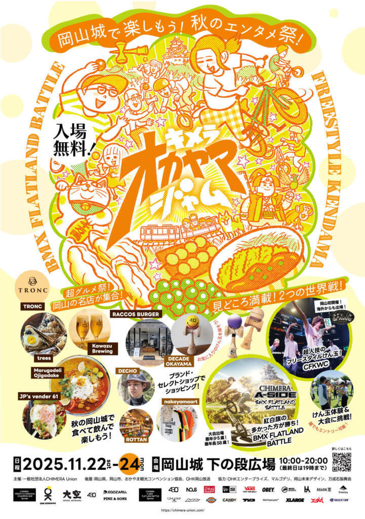 さらに今回は、BMXと並行して「けん玉ワールドバトル」も開催。日本の伝統とストリートが融合する“OKAYAMA JAM”として、グルメ、ファッション、音楽、アートが彩るカルチャーフェスティバルに進化。世代や国境を越え、誰もが“感情のバトル”を体感できる3日間。2025年秋、名城・岡山城の麓が世界の祭り場に変わる。