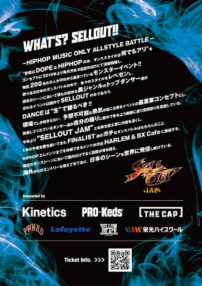 今年より”SELLOUT JAM”と名称を変え更に内容を濃くし、1年の予選を勝ち抜いてきたFINALIST達のガチなダンスバトルはもちろんのこと、HIPHOPエレメンツ全てを体感できるメンツが渋谷HARLEM & BX Cafeに集結。現在のダンスシーンにおいて国内だけでなく話題が海を超え、海外からのエントリーも増えてきており、日本のシーンを世界に発信し続けている。