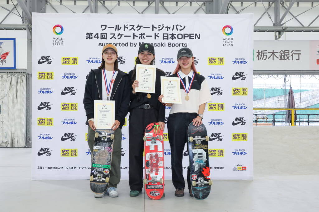 栃木県宇都宮市に新設された「アークタウン宇都宮」内スケートパークで開催された「ワールドスケートジャパン第4回日本OPEN supported by Murasaki Sports」。ストリート女子決勝は優勝が赤間凛音、2位に吉沢恋、3位に伊藤美優という結果になった。