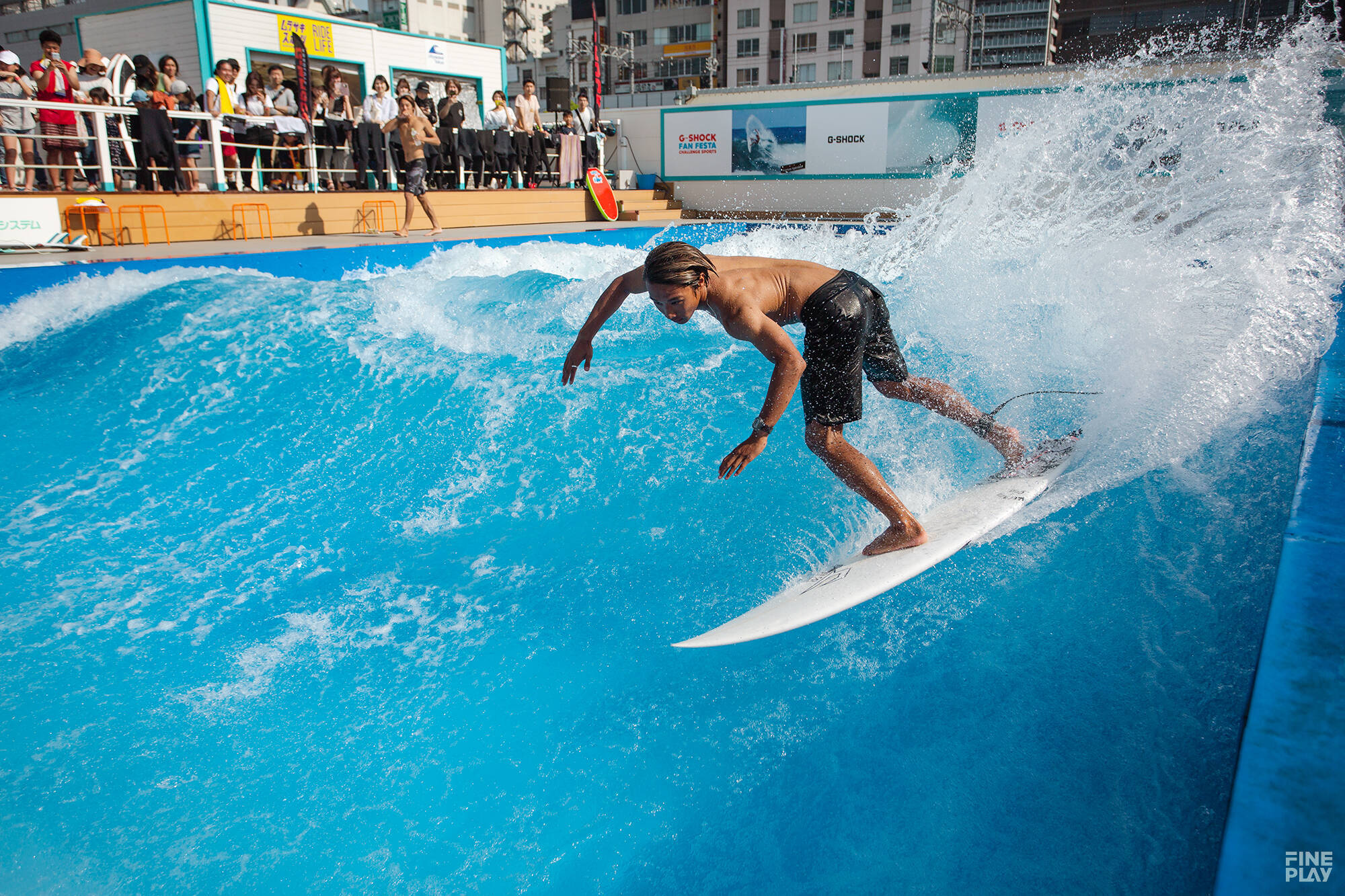 G-SHOCK FAN FESTA 2019 CITYWAVE PRO Powered by MURASAKI SPORTSと題して、人工波生成システム「citywave」を用いた、citywave Tokyo初のプロライダーによるサーフィンコンテストが開催された。普段は海で行うサーフィンの大会では、観戦する際どうしても競技をするライダーとの距離が遠くなってしまうが、今回のウエーブプールでは演技を間近で見ることが出来るため、ライダーの飛ばすスプレー(水しぶき)を観客が浴びるシーンなども見受けられた。大会は招待ライダーのMen’s 10名が出場し、サーフィン日本代表候補も多数参加した。ファイナリストに残った3名は大橋海人、渡辺寛、大音凛太といった日本トップクラスのプロサーファー、決勝の舞台では全員が50点満点中40点以上をマークする接戦となったが、準決勝3位通過の大音凛太が決勝でこの日一番のスコアを記録し見事優勝を果たした。大音凛太は過去に国際大会で日本代表選手として派遣された経験を持つ今後期待のティーンエイジサーファーであり今後の活躍も期待だ。