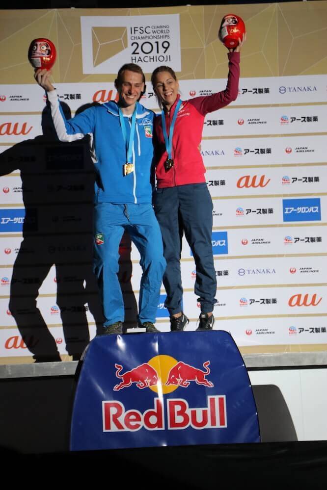 「IFSCクライミング世界選手権2019八王子」はオリンピック出場選手の選考も兼ねており、18日からはいよいよその代表を決めるコンバインド競技の予選が行われる。決勝は女子が20日、男子が21日に行われ、男女ともに上位7名にはオリンピック出場枠が与えられ、日本人最上位選手は代表に内定する。優勝したルドヴィコ・フォッサリ(写真左)とアレクサンドラ・ミロスラウ(写真右) photo by shuhei kaneko
