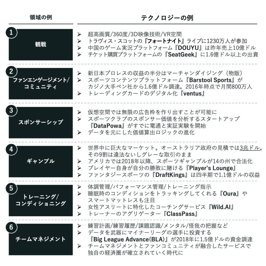 前回の連載の最後で、スポーツテックの領域は下記の6つに代表されるのではないかと述べました。