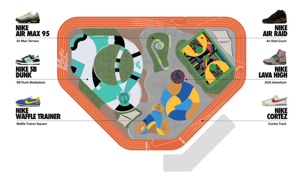 ランニングトラックのデザインは1960年代を「はじまりのものがたり」と題し”コルテッツ”から、遊具がある広場のデザインは1970年代を「ナイキブランドの誕生」と題し”ワッフルトレーナー”から、ジャングルジムのデザインは1980年代を「新しい場所へ」と題し”ラバハイ”から、3×3のバスケットコートのデザインは1990年代を「世界中に羽ばたく」と題し”エアレイド”から、スケートボードプラザのデザインは2000年代を「スポーツとストリートの出会い」と題し”SBダンク”から、パークを一望できる高台のデザインは2010年代を「エアの進化」と題し”エアマックス”からインスピレーションを得ている。