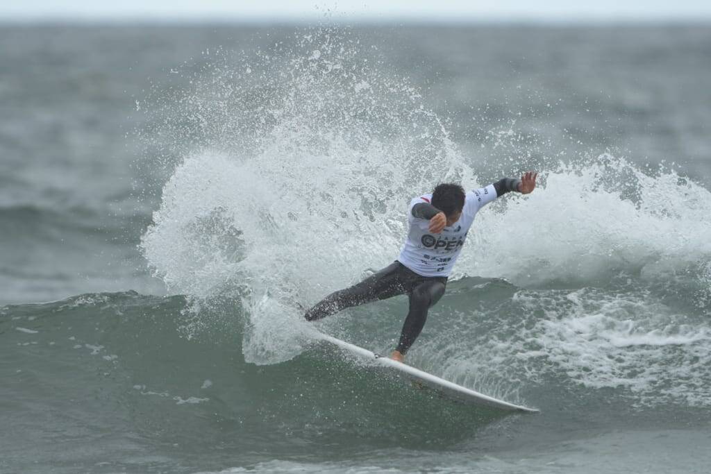 大会最終日、釣ヶ崎海岸の天気は早朝から小雨、午後にかけて徐々に曇りとなった。風は北西4m/sの弱オンショアで、アベレージ腹~胸サイズの波が速めにブレイクするコンディション。時折バックウォッシュが入る、よれた波が目立った。 大原洋人 ©JAPAN OPEN OF SURFING