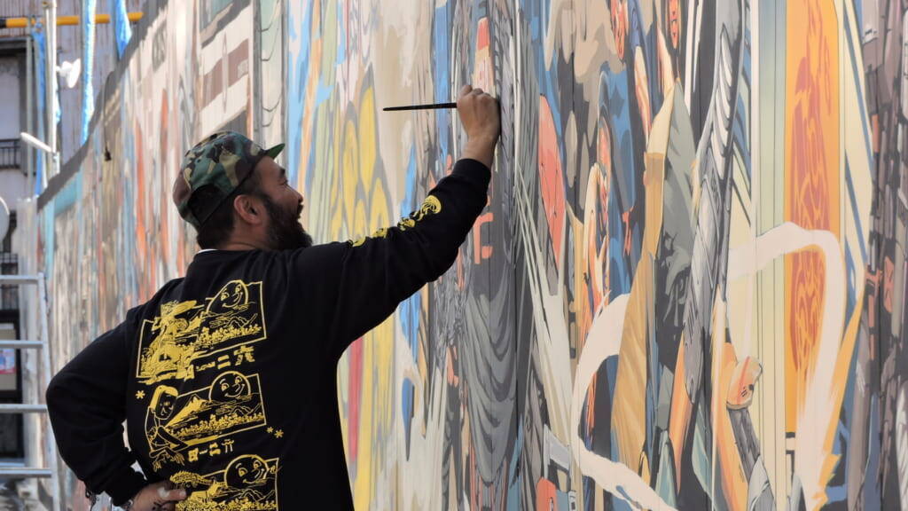 このミューラルアートは、新本庁舎竣工予定の令和4年度までで、約2年間残される予定とのこと。現場で見るとよくわかるが、その迫力と何より書き込み量に驚く。工事現場が観光名所になる可能性が大いにあるほどの大作だ。それぞれの担当エリアがセパレートされているのではなく、5人のアーティストがお互いをリスペクトしながら、56mの壁を1枚画として描ききった。