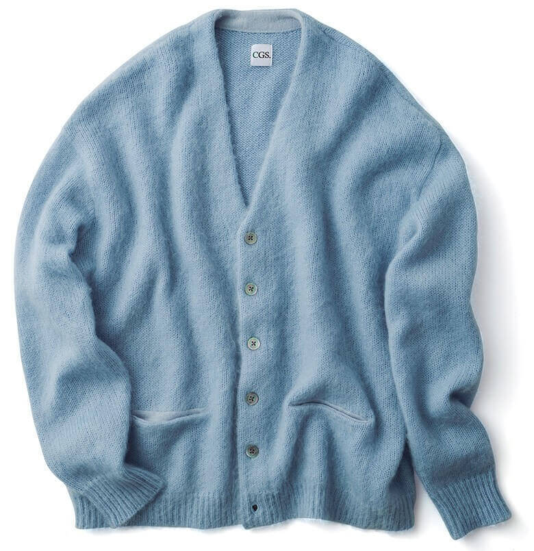 2万9700円/CGSざっくりとした毛並みのモヘアカーディガンをオーバーサイズで仕立てた。落ち着いたサックスブルーの色みが、まさに海の色気という感じ。