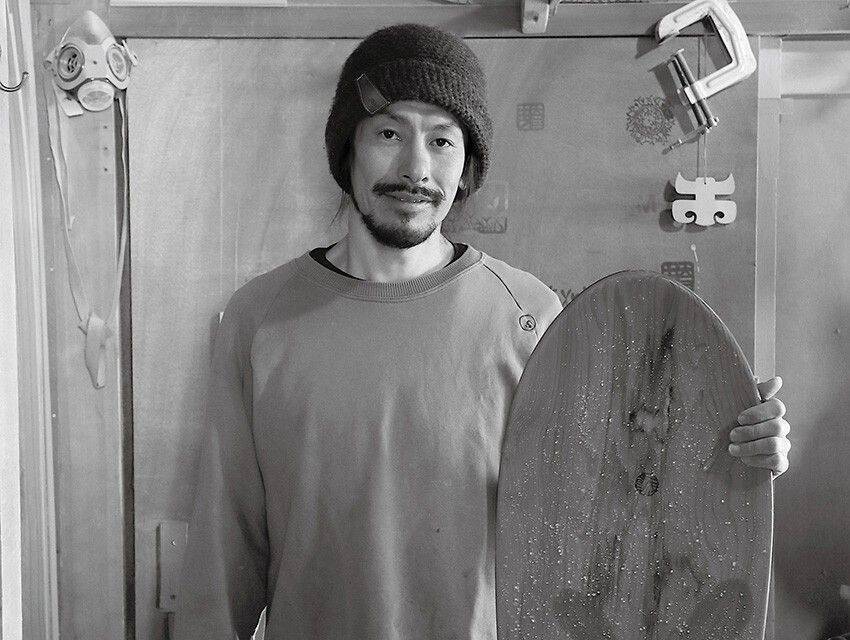 雪板とは文字どおり“雪の上で使う板”であり、この“スノーボードの原型”と思えるモノを現代に蘇らせたのが五明淳さん。生まれ育った長野県で、8歳でスケートボードを、13歳でスノーボードを始めたプロスノーボーダーである。