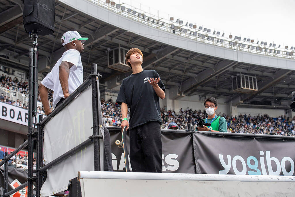 しかも、彼にとってはそこからさらに追い討ちをかける出来事が起こった。池田大暉、白井空良という日本勢の会心のランを見せたのだ。全選手の先陣を切って走り出し、1本目に会心のノーミスランを見せた池田大暉は思わずカッツポーズ、そしてノーミスとまではいかなかったものの、白井空良はキャバレリアルシュガーケーングラインド(進行方向と逆に進みお腹側に360度回転しながら後ろ側のトラックで対象物をまたぎ越してから斜めに掛けるトリック)やバックサイド180スイッチフロントサイドクルックドグラインドという、おそらく世界で彼以外にできる人物はいないであろう2トリックを成功させ、堀米の滑走直前までは彼らがワンツーフィニッシュ。