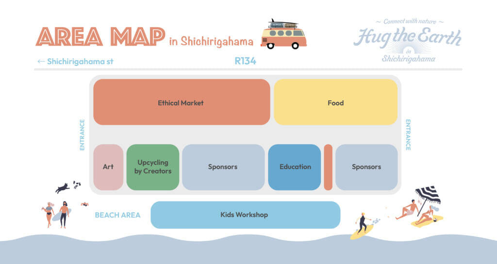 再生サーフボードの展示や、サーファーが乗る電気自動車の提案など、サーフカルチャーが根付く鎌倉市七里ヶ浜ならではのコンテンツや、海のアート展、地球と人に優しいエシカルマーケット、オーガニック商品やアップサイクル、地元鎌倉の人気ショップなどなど、子供から大人まで楽しみながら環境問題に触れて、共に考えることができるイベントとなっている。