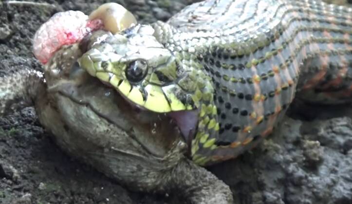 ヒキガエルを襲って、噛んだ箇所から飲み込もうとしているヤマカガシの貴重な動画を見つけました。