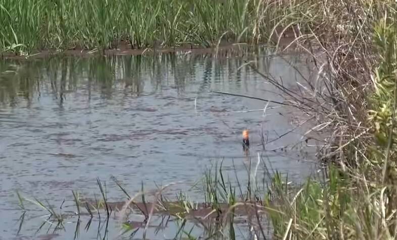 水面に広がる藻の上を中空フロッグルアーでトレースしていると、いきなりボワッ!と水柱が立ってルアーが消えてしまうことが。