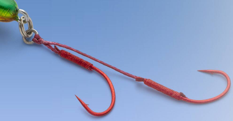 お腹の部分にはフックは付いておらず、最後尾のアイにのみ2連のリーダー付きシングルフックが装着されています。