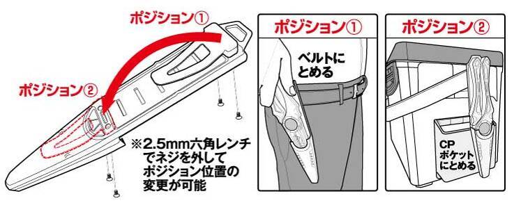 付属品として、落下防止目的でズボンのベルト通しに引っ掛けるカラビナや、、尻手ロープが備わっています。