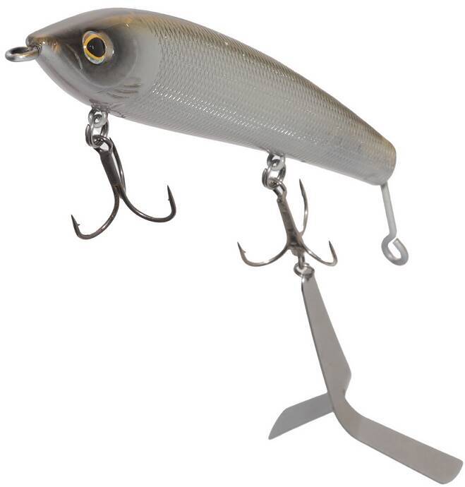 ダイビングペンシルに見えるフォルムですが、大きな金属ペラや突き出たヒートンを後部に搭載しています。