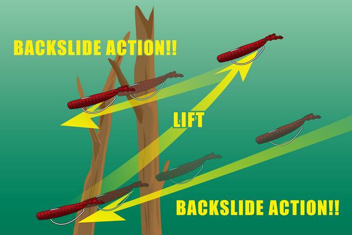 そうするとノーシンカーリグでキャストしたとき、蛇腹状テールの逆側を先頭にして、斜め下方向へフォール=バックスライドフォールしていきます。