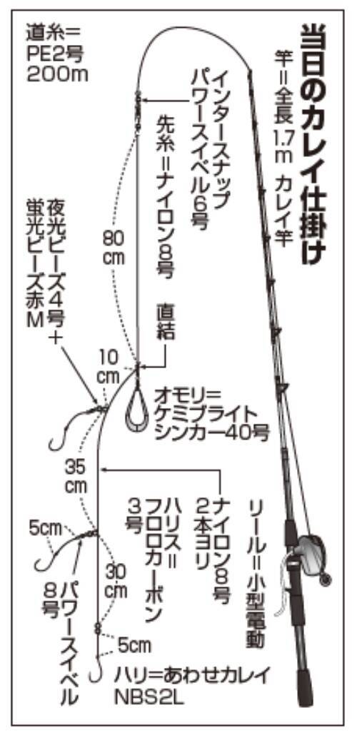 初冬のマコガレイは抱卵で食い渋るが、ヒガレイ(ムシガレイ)は良型が多く面白い時期で、水深50m以深の深場を狙う。