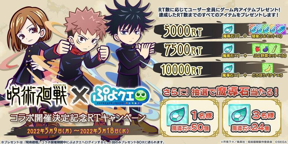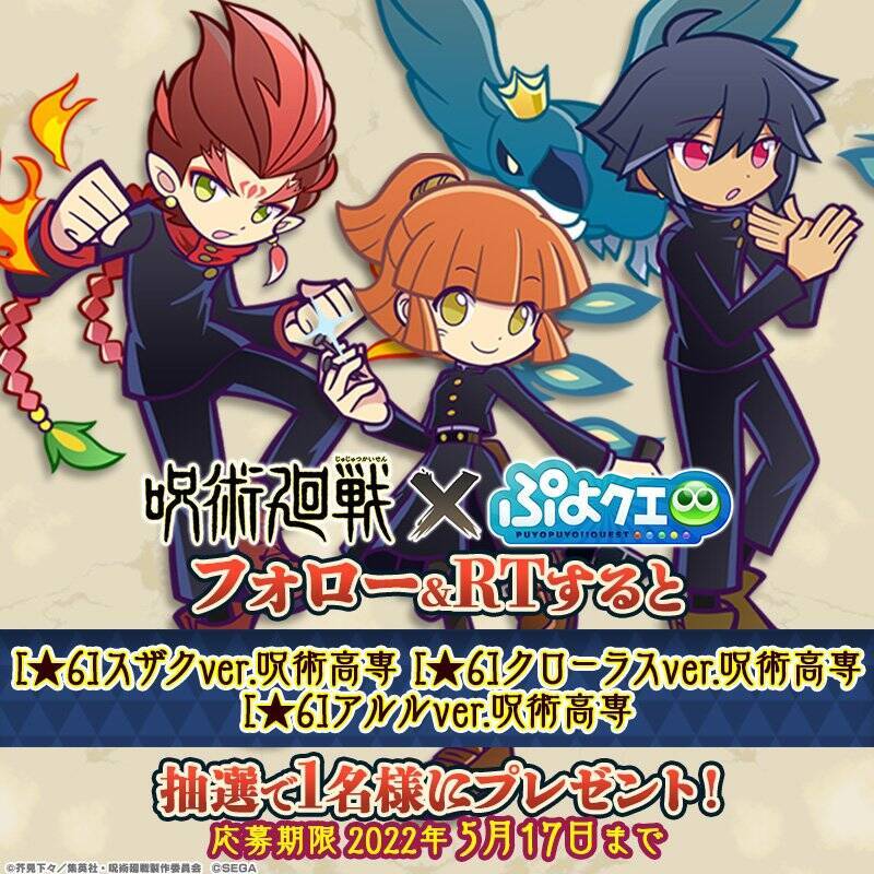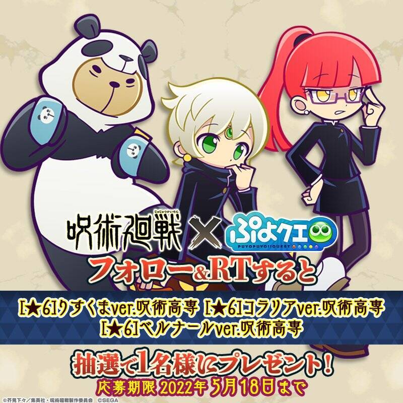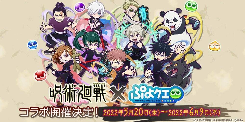 株式会社セガより好評配信中のパズルRPG「ぷよぷよ!!クエスト(以下、「ぷよクエ」)」と、TVアニメ「呪術廻戦」のコラボイベントが2022年5月20日(金)から開催されることが発表されました!