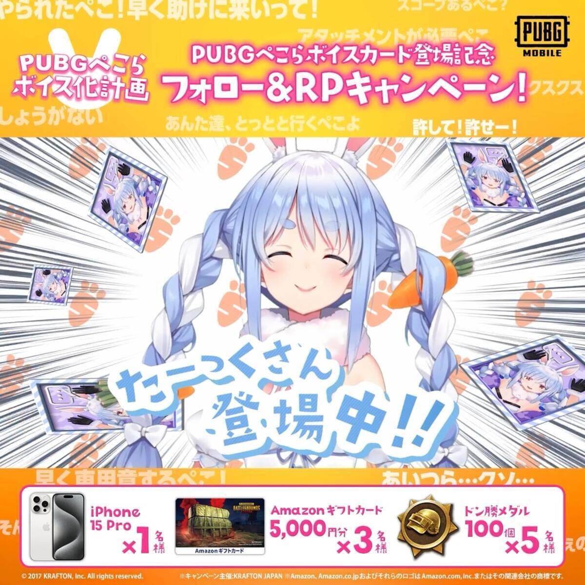 兎田ぺこらさんのボイスカード実装を記念して、2024年1月10日(水)からPUBG MOBILE JAPAN公式X(@PUBGMOBILE_JP)にてフォロー&RPキャンペーンが開催中です。