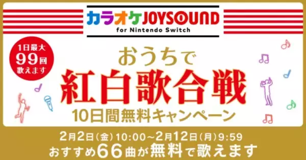 2024年2月2日(金)から2月12日(月)まで、対象の配信曲を1日99回無料で歌える「カラオケJOYSOUND for Nintendo Switch」の「おうちで紅白歌合戦 10日間無料キャンペーン」が行われます。