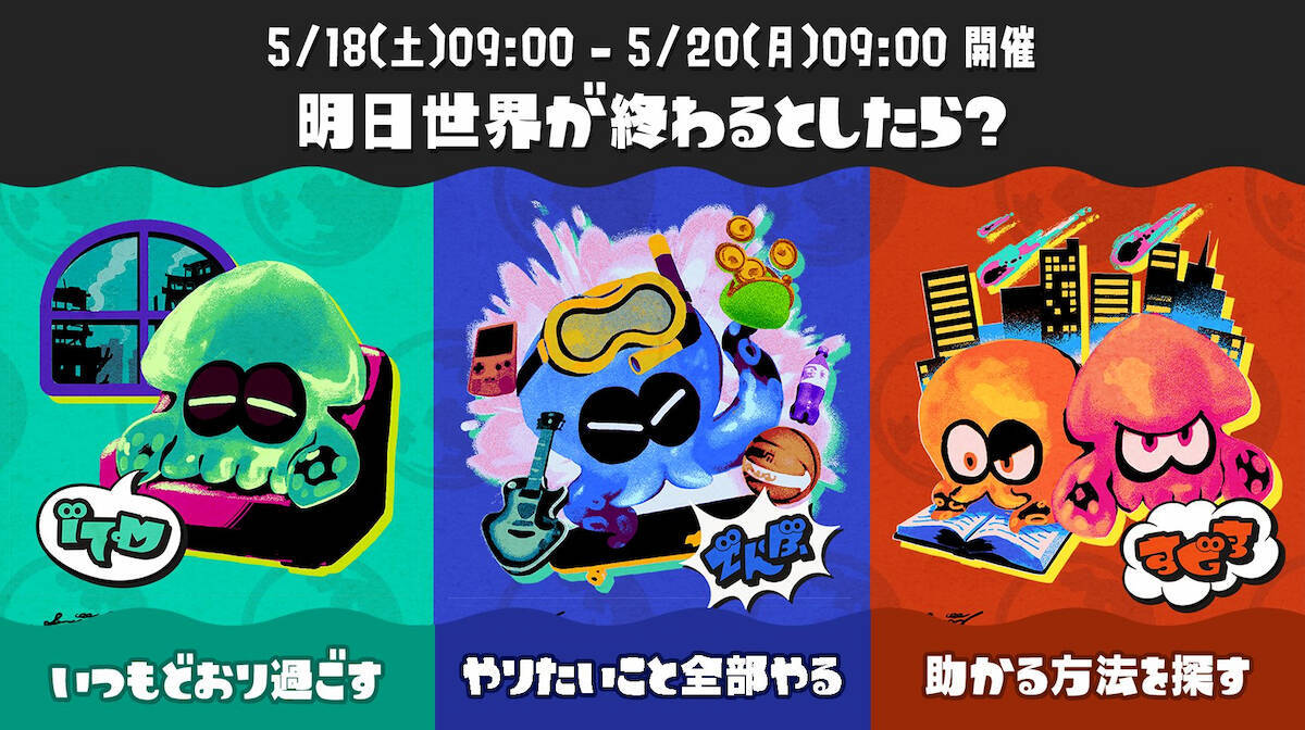 何やら不穏だが、おそらく明日からも世界は続いていくので安心してご参加いただきたい。pic.twitter.com/0FnT9cn14T— Splatoon(スプラトゥーン) (@SplatoonJP) May 2, 2024