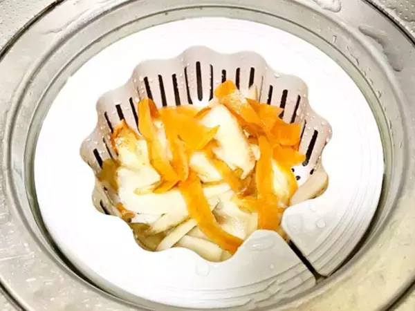 調理の際に出たニンジンやジャガイモの皮が、『抗菌排水口キャッチ』に溜まった状態で、水を流してみると…。