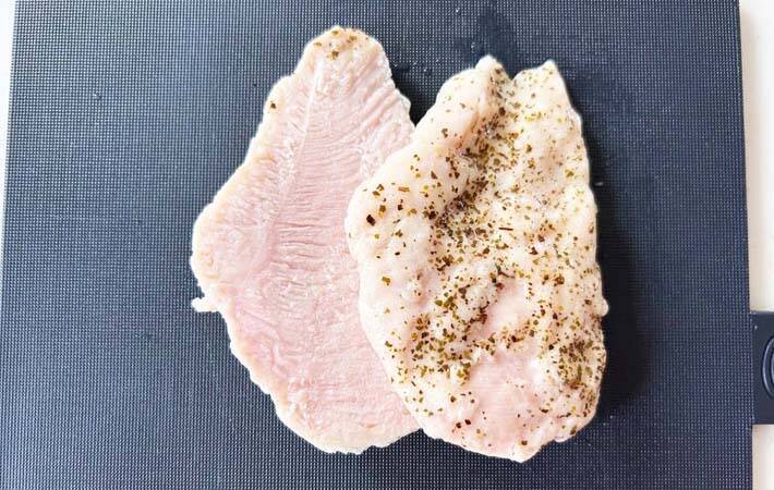まず、サラダチキンを横半分にスライスします。筆者は風味がよさそうだと思ったので、ハーブのサラダチキンを使いました。
