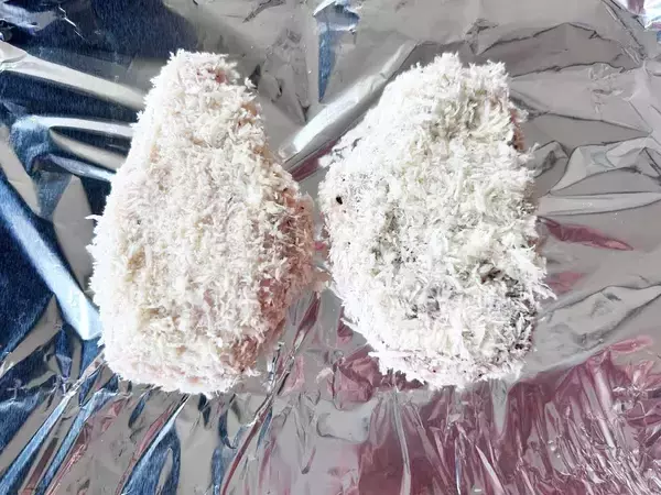 マヨネーズを塗ったサラダチキンに粉チーズを振り、パン粉をまんべんなくまぶしてください。